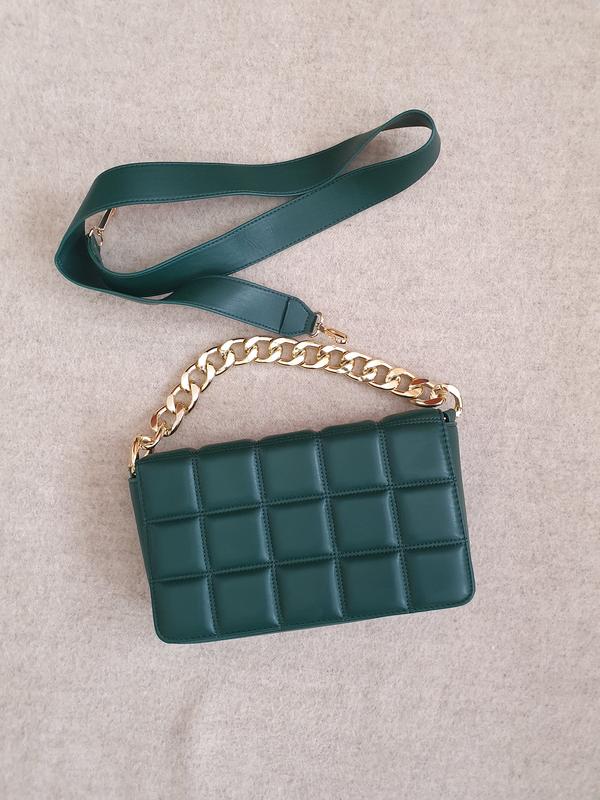 Сумка клатч Accessorize глибокого зеленого кольору з екошкіри. Фурнітура золотиста. Коротка ручка незнімна 38 см, знімний ремінець 100 см. загальна довжина. Має одне відділення, застібка магнитна, розмір 27×15×4 см. Стан нової, без нюансів.