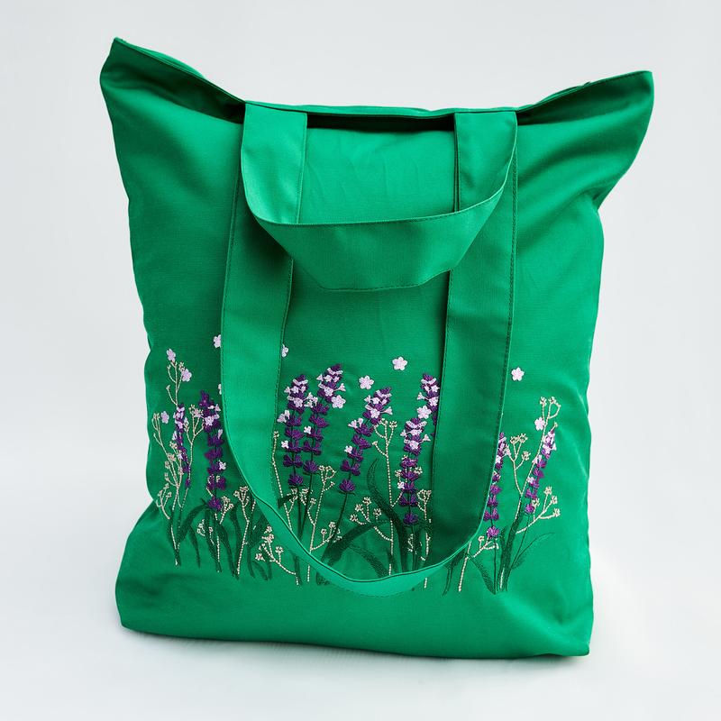 Сумка пляжная тканевая, цвет - зельоная, на молнии, вышивка - лаванда.