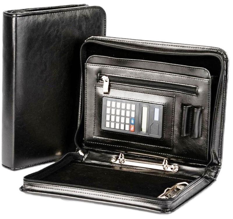Деловая папка из искусственной кожи Amo, Польша Ssbw10 black Элегантная и классическая папка подойдет для всех Ваших мелких вещей, а также сохранит все Ваши важные документы в целости и сохранности. Описание товара: Эко кожа отлично имитирует натуральную кожу. Материал устойчив к повреждениям, вызванным изменением погоды и истиранию. Папка закрывается на молнию. Два открытых отделения. Один карман на молнии. Две петли для ручек. Калькулятор Сегрегатор. Крепление для блокнота формата А5, Характеристики: Размеры: 27х20х4 см. Цвет: черный. Материал: искусственная кожа. Производитель: AMO, Польша. Формат документов А4 не помещается!