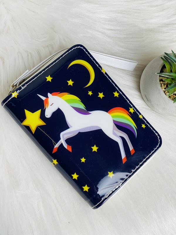 Детский Кошелёк мини Единорожка Арт: 914-2 Price: 99 uah. В наличии яркие стильные мини кошельки для деток Очень компактный,поместиться в любую сумочку или рюкзачок Внутри два отдания для купюр, один для мелочи и два кармашка для карточек. Материал: экокожа лак Размер: 13/9
