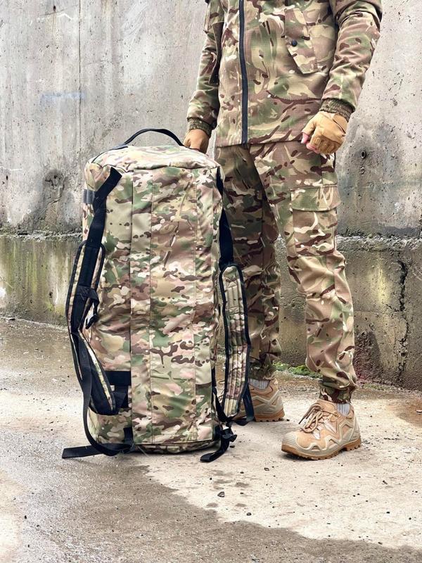 - Зроблений з міцної тканини oxford c вологовідштовхувальною підкладкою; - Дуже місткий; - Має лямки для носіння на спині, за допомогою механізму фаст дозволяє дуже легко та швидко закріпити лямки баула на тілі; - Є ручки для носіння в руках; - Одне велике відділення для речей на змійці, прикритій клапаном на липучках, що запобігає попаданню вологи всередину; - Збоку від основного відділення є невелике відділення-кишеня, так само на змійці, для речей до яких потрібен швидкий доступ; - Зверху є липучка для патчів прикрита нашивкою з основної тканини. Кольори: Мультикам Піксель