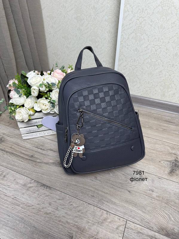 🌺Великий стильний, зручний рюкзак. 🍀Формат А4. 🍀Виготовлений з екошкіри. 🍀Розмір: ширина 28 см., висота по спинці 35 см., дно 12 см. ✔️Одне велике відділення на блискавці і дві бокові кишені. ✔️Попереду дві кишеньки на блискавці і ззаду одна кишенька на блискавці. ✔️Брілок знімається. 🟡7981