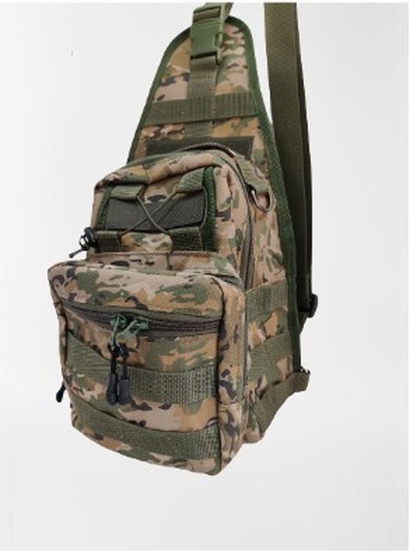Чоловіча тактична сумка-рюкзак з однією лямкою. Одне відділення на блискавці із двома внутрішніми кишенями. Попереду 1 об'ємна кишеня на блискавці+ додаткова кишенька; На задній частині одна велика кишеня на кнопці; 22 петлі MOLLE для кріплення. Матеріал: Cordura; Розміри (ШхВхГ): 20х25х10.