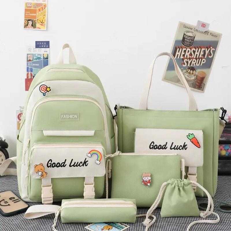 Жіночий рюкзак комплект 5 в 1 має кілька особливостей: - В середині рюкзака є одне відділення, розділене на дві частини. Це дозволяє зручно організувати та розділити речі. - На передній частині рюкзака є кишені. Це надає додатковий простір для зберігання та легкий доступ до дрібниць. - Рюкзак поставляється в комплекті з брелоком ведмедиком та значками. Це милі аксесуари, які надають рюкзаку унікальний стиль. - Матеріал рюкзака виготовлений із поліестеру. Поліестер має гарну міцність і стійкість до зносу, що робить рюкзак довговічним. Розміри цього рюкзака: Висота: 45 см Ширина: 32 см Глибина: 14 см Цей рюкзак пропонує практичне використання із зручним внутрішнім поділом, додатковими кишенями для організації речей, а також поставляється разом із аксесуарами для додавання стилю.