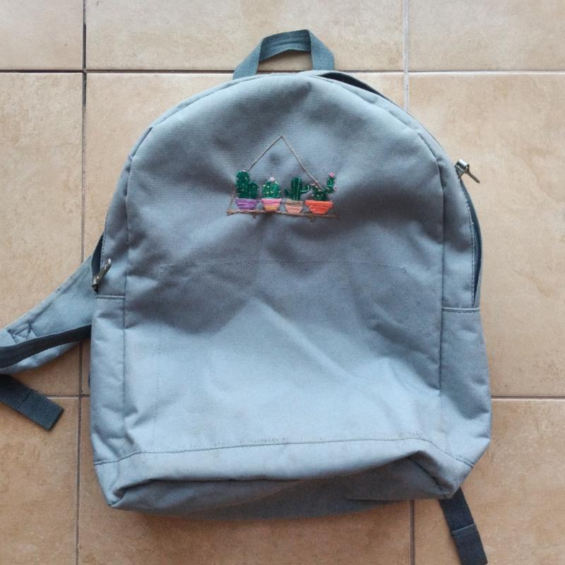 Сірий рюкзак з ручною вишивкою кактуси, міцні лямки, без дефектів