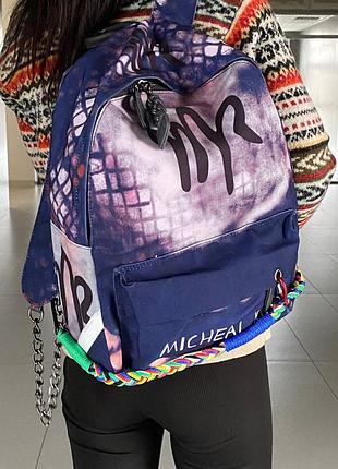 Восхитительный цветной рюкзак с принтом в виде граффити Michael Kors Арт 3002 Цена 1499 грн Размер 39*30*12 см Материал качественная крепкая парусина {натуральное льняное полотно высочайшей прочности} покрыт защитным слоем, не промокает Цвет комбинированный - основная гамма - это синий графит, с черными и лиловыми элементами Рюкзак украшен стильными плетеными подвесками из ткани, косичками из искусственной кожи и металлическим брелком. Невероятно вместительный и удобный! Внутри одно большое отделение и карман на молнии для мелких вещей. Стеганная спинка, очень удобен в носке, особенно на каждый день. Плетеные канаты выполняют роль не только украшения, но и при желании с помощью их карабинов можно фиксировать рюкзак дополнительно на поясе