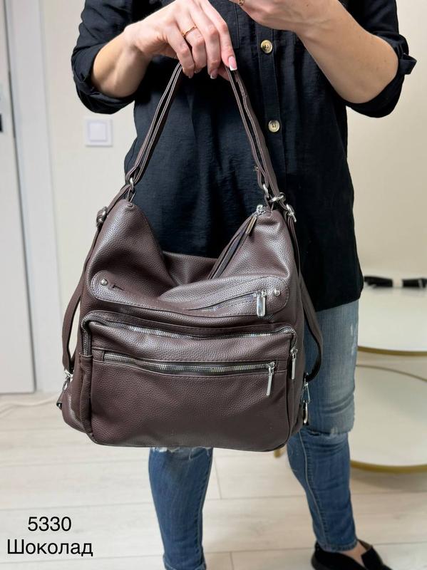 Новинка Сумка-рюкзак Екошкіра 34х 33х 11 Всі кишені та блискавки-діючі⚠️ Два основних відділи на блискавці. Всередині кишеня на блискавці та відкрита кишеня. На лицевій стороні 3 відділи на блискавці та кишеня під клапаном. На звороті кишеня на блискавці.