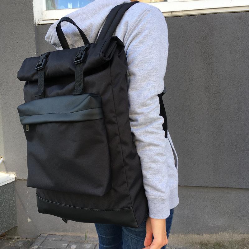 Місткий рюкзак, виконаний з непромокаючої тканини та шкірозамінника Є два зовнішні кишені Всередині на підкладці і кишеня на блискавці В розгорнутому вигляді висота 61 см, у згорнутому 46 см, ширина 33 см
