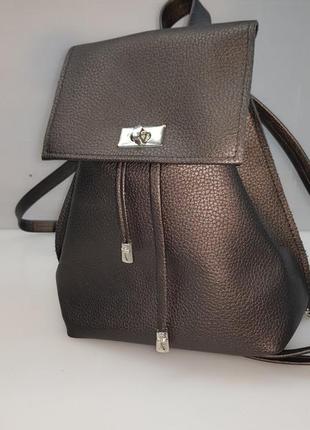 Компактный, вместительный рюкзак. Можно носить и как рюкзак, и как сумку. Цвет шоколадный. Есть такие же: черный, темно-синий, белый, золотой. Фурнитура серебряная. Размер: высота 28 см, ширина 19 см, глубина 12 см. Внутри имеет одно отделение и карман.