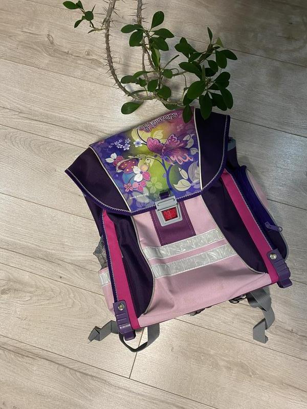 На тілі немає)виміри на фото)застібається на засчелку,принт природа-квіти,є вставки-відбивачі,всередині одне велике відділення з перегородкою і додатковими кишенями,на спинці м'яка пружна вставка для зручності при носінні,ручки м'які широкі є додаткова застібка щоб не сповзали ручки з плечей,ручки регулюються до потрібного розміру,на дні сумки фіолетові ніжки дно пружне туге)