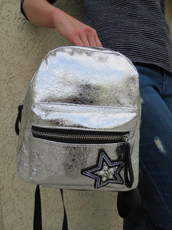 Рюкзак - сумка з одним великим і маленьким відділеннями на блискавці. Всередині - текстильна підкладка і невеликий кишеню. Кишенька так само і на тильній стороні рюкзака, туди можна покласти цінну річ і не переживати за її збереження, наприклад, у транспорті. Лямки легко відстібаються і рюкзак швидко перетворюється в зручну сумку. Аксесуар виділяється стильним декорацією. Розмір: 24х20 см.