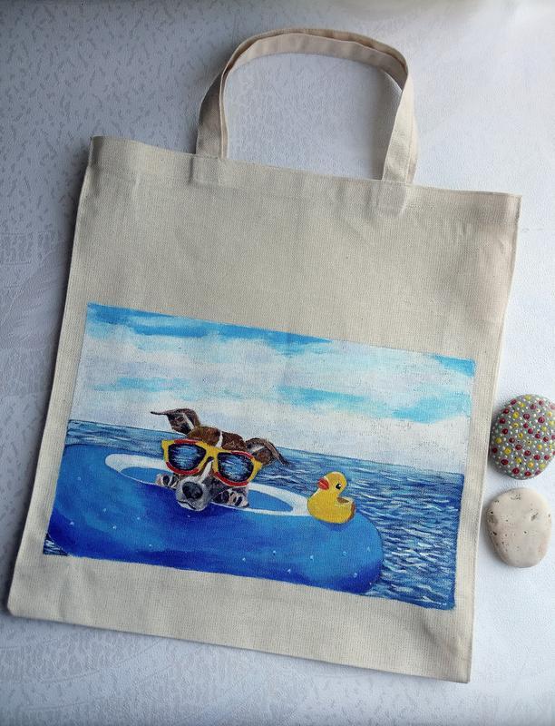 Продається сумка (торба) для покупок та сніданків (шопер, еко-сумка). Ручки короткі, зручно носити на роботу або на навчання. Її розміри: 32*35*7 см. Довжина ручок 30 см (висота ручок 13,5 см). Тканина двунитка, 100% бавовна, колір бежевий. Сумочка пошита міцно. Ручки укріплені. Бокові шви прострочені два рази. Ручний розпис виконаний фарбами по тканині і термічно закріплений. При делікатному пранні не змивається. Або виконаю на замовлення іншого розміру, кольору, з розписом бажаного малюнка, наприклад, домашнього улюбленця чи таке інше і така сумочка може бути приємним, несподіваним подарунком.