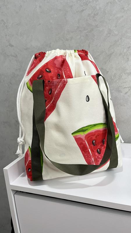Літній шоппер з кавунами: ваш найкращий друг у справах із смаком! Цей шоппер несе не лише ваші покупки, але й літнє настрій та аромат кавунів. З ним кожен шопінг стає солодким і освіжаючим! Матеріал бавовна з водовідштовхуючими властивостями Один відділ Спереду і ззаду дві кишеньки Розмір 38*40см Ручки 20см