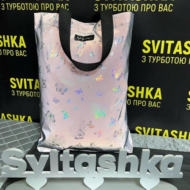 Світловідбиваюча сумка Світашка Метелик це стильний шоппер для Ваших речей. Тканина має світловідбиваючі властивості, що дає змогу виділяти Вас на дорозі чи тротуарі в темний час доби. В цьому шопері укорочені ручки, щоб було зручно носити в руках. Розмір 49*33*6 см разом із ручками 60 см. Тканина 100% поліестер Країна виробництва Україна