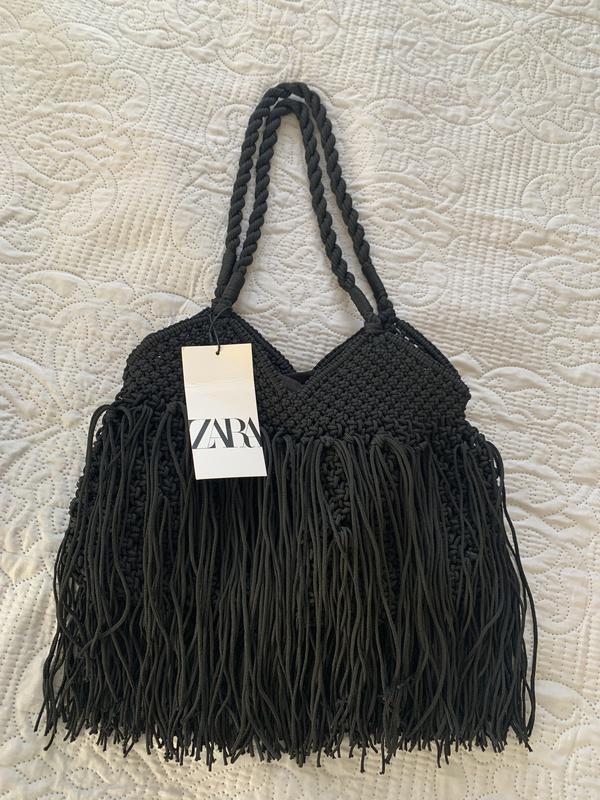 СУМКА-ШОПЕР З МАКРАМЕ Сумка-шопер із макрами з бахромою та ремінцями на плече. Зовні 100% поліестер ПІДКЛАДКА 100% Бавовна Висота x довжина x ширина: 27 x 33 x 4.6 см.