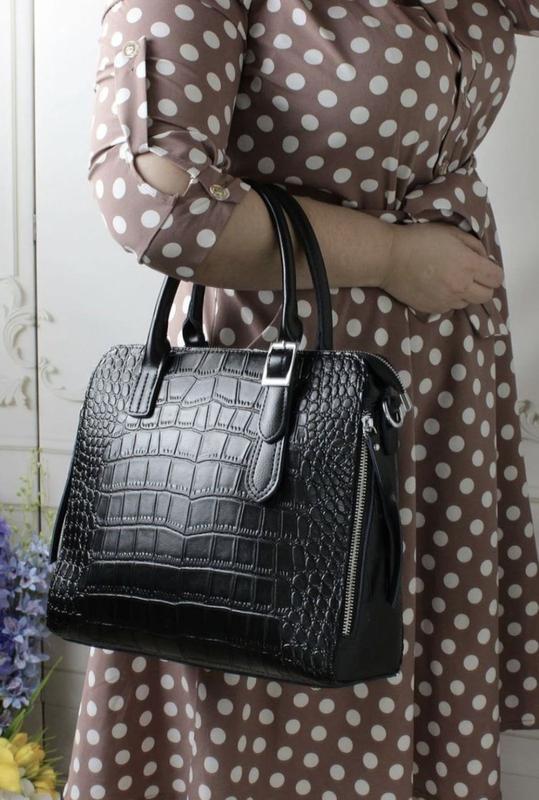 Натуральная кожа. В наличии черная и цвет айвори. В комплекте есть длинная регулируемая ручка на плечо. Ширина 30см, высота 28см, ширина дна 12см Внутри есть перегородка на молнии, 2 отделения и карманы.