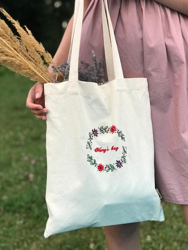 красива сумка з машинною вишивкою з міцної щільної тканини двуніткі хлопок100%,довжина ручок 60см розмір сумки35*37см,Можливо вишивка з вашим іменем