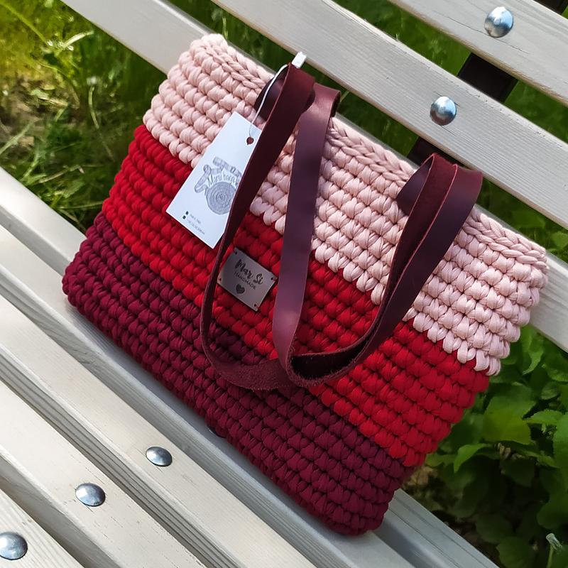 Сумка ручной работы. Эксклюзивный аксессуар! Связана крючком из трикотажной пряжи. Размер 35/26 см. Ручки из натуральной кожи, 60 см. Внутри подклад с кармашком. Сумка без застёжки! Отличный вариант на лето!