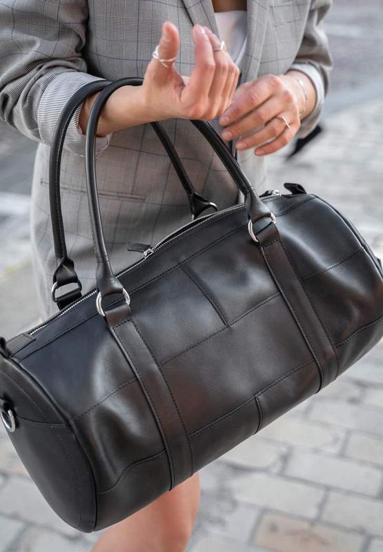 Матеріал: натуральна шкіра Розмір, см: 42 / 23 / 23 (Д/В/Г) Сумка закривається на блискавку. Містить два внутрішні відділення. Додаткова зовнішня кишеня для зберігання дрібниць, телефона та ключів. Висота ручок від верху сумки: 13 см Довжина плечового ременя — 130 см У комплекті мішок для вологих речей або спортивної форми (43 x 33 см) водонепроникного матеріалу Cordura 1000D виробництва США. Колір чорний
