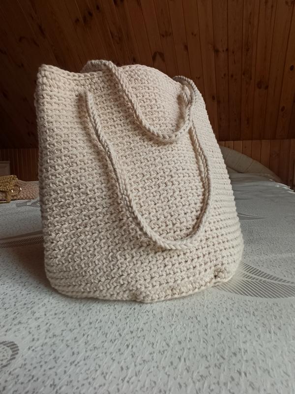 сумка молочного кольору з круглим дном ручна робота висота 18 см діаметр 19 см довжина ручки 50 см
