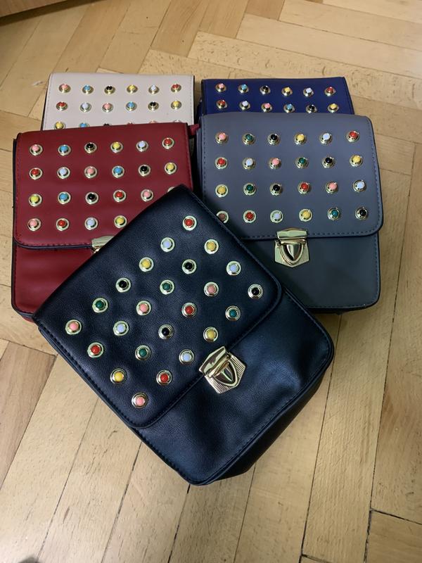 Сумочка чорного кольору Є в кольорах(уточняйте) Декор: на фото Розмір: висота 20, ширина 17, товщина 5-6см, ремішок знімається, регулюється, приблизно 130-140см