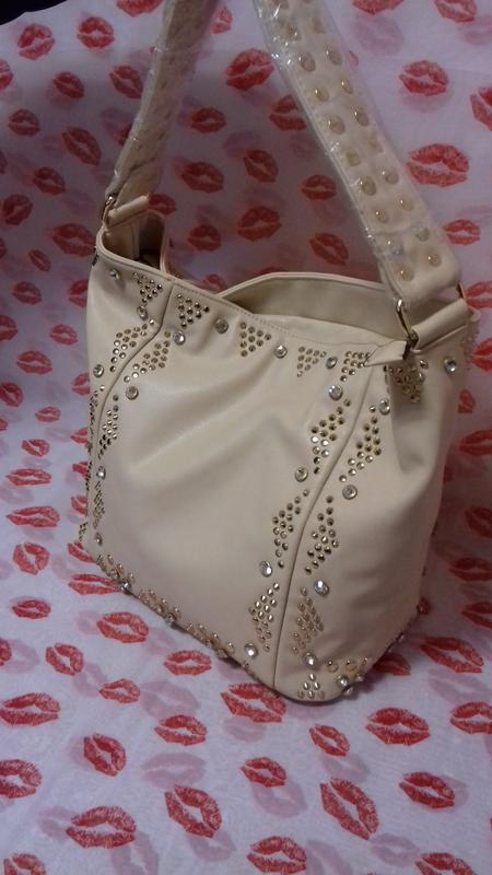 Очень интересная сумочка хорошего качества, материал экокожа, декорирована камнями и мелкими шипами, довольно вместительная и удобная. Внутри два больших отдела и дополнительно маленькие. Замеры: длина 32 см, ширина 18,5 см, высота 32 см.