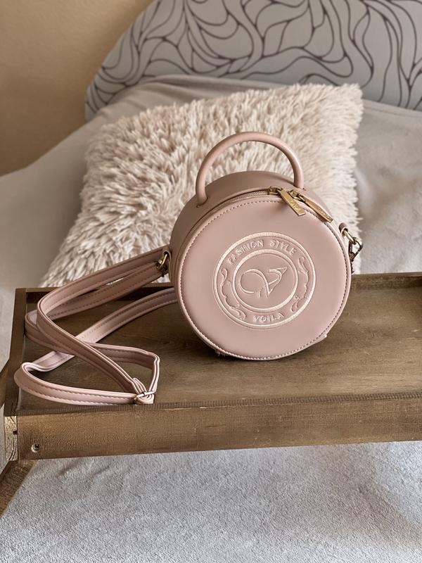 Круглая сумка цвета пудра, внутри одно отделение, есть ручка и дополнительно ремешок. Состояние отличное, отдаю за треть цены.
