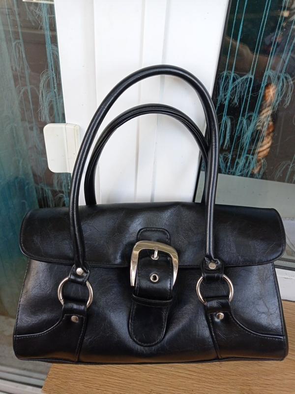 Сумка складається з 3-х відділів, середній закривається на застібку. Також є два маленьких карманчика і один карманчик на невеликий застібці. Усі застібки робочі. Ширина по низу 32см, высота 19см, глибина по низу 11см, довжина ручок 51см.