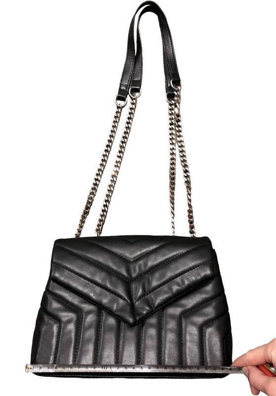 Сумка має 2 відділення, між ними кишеня під замком, і 1 кишеня звичайна. Довжина - 26 см Ширина по дну - 9,5 см Висота - 19,5 см Довжина ручки - 82 см Сама сумка в нормальному стані, лише є нюанси з: місцями метал затерся по поверхні ланцюга надірвана трохи кишеня всередині.