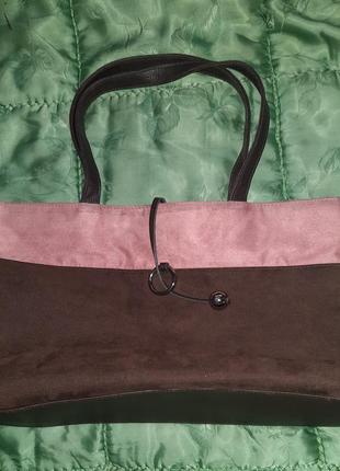 Сумка очень красивая сверху под замшу, ручки под кожу. на кнопке и сверху такой шнурок как застёжка