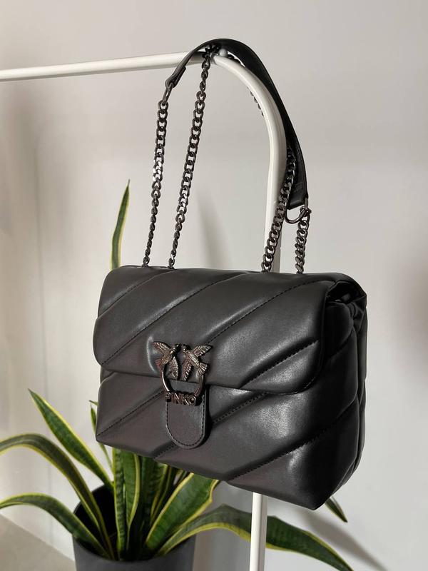Pinko Puff Black Logo Bag Арт: 0085 Розмір: 25 x 19 x 11 см Матеріал: еко шкіра Опис: Люкс якість! Сумка виконана з еко шкіри. Всередині одне велике відділення, також є маленька кишенька. Підкладка всередині сумки із якісного чорного текстилю. Ремінець - ланцюжок з ручками з еко шкіри на який нанесений логотип бренду. Ремінець регулюється. Безкоштовновний комплект: брендова коробка + пакувальний папір. Платний комплект +200 грн: брендовий пакет, пильовик та набір документів.