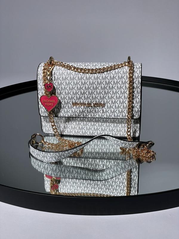 👜 Michael Kors Mini Bag White (Арт: 12063) 📐 Размер: 21 х 14 х 6 см 🧵 Материал: Еко Шкіра 🔎 Опис: Сумка виготовлена з гладкої еко шкіри з фірмовим принтом. Усередині одне велике відділення, є невелика кишенька. Ремінець у вигляді золотистого ланцюжка, ручка з екошкіри. Підкладка всередині сумки із чорної еко шкіри. Ремінець можна налаштувати під носіння не тільки через плече, а й у руці. Комплектується у брендованій коробці та папері (за додаткову плату можна придбати документи, пильовик та фірмовий пакет).