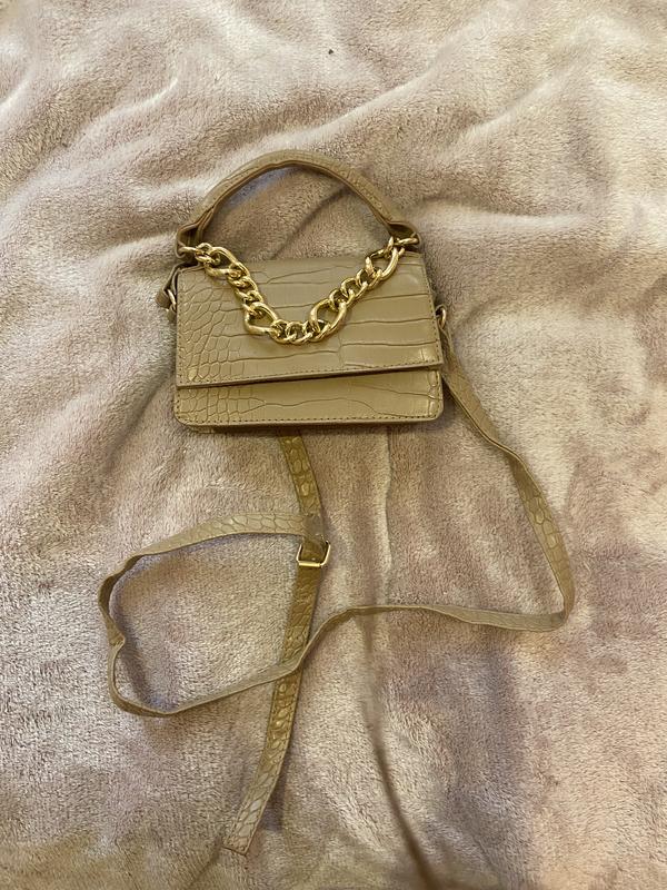 Сумка бежевого кольору з золотим ланцюжком спереду.
