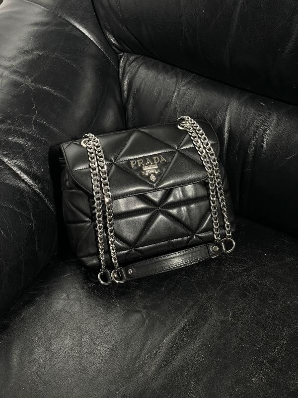 👜 Prada Nappa Spectrum Black/Silver (Арт: 05050) 📐 Розмір: 25 х 18 х 9 см 🧵 Матеріал: Еко Шкіра 🔎 Опис: Сумка виконана з гладкої екошкіри, з трикутним простроченням. Усередині два відділення, в одному з яких є невелика кишенька. Підкладка всередині сумки текстильна, з фірмовою нашивкою. Ремінець сумки на ланцюжках, з ручками із еко шкіри. Регулюється ремінець як під носіння в руці, так і через плече. Комплектується у брендованій коробці та папері (за додаткову плату можна придбати фірмовий пакет, пильовик та документи).