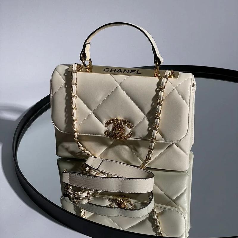 👜 Chanel Classic Cream/Gold (Арт: 04031) 💵 1699 грн 📐 Розмір: 26 x 18 x 9 см 🧵 Матеріал: Еко Шкіра 🔎 Опис: Сумка виконана з екошкіри, логотип у вигляді ланцюгів та замочок – металеві. Усередині два великі відділення, а третє меншим розміром на блискавці. Підкладка всередині сумки – із щільного текстилю. На задній стінці сумки є ще одна невелика кишенька. Також в додаток до 3 повноцінних відділень є 3 кишеньки, які не призначені для зберігання, але вони є ;) Ремінець завдовжки 120 сантиметрів (у металевий ланцюг вплетений шкіряний ремінець). Комплектується у брендованій коробці та папері (за додаткову плату можна придбати фірмовий пакет, пильовик та документи). Kisdro
