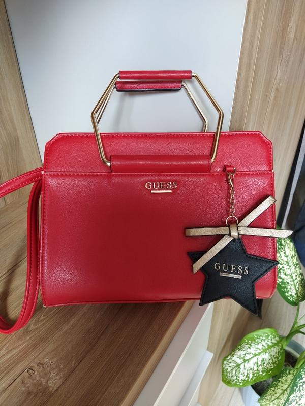 Сумка відомого бренду Guess, купувалась в магазині в Австрії. Оригінальної красивої форми, з якісною фурнітурою. Яскраво червоного кольору. Є невеличкі нюанси на кутиках (є на фото) які легко усунути в будь-якому сервісі ремонту сумок. Сумка дуже добротна, гарно тримає форму, незвичайного і свіжого дизайну. Є довгий ремінець, червона підкладка, в ідеальному стані все крім кількох кутиків, яких навіть зблизька не видно.