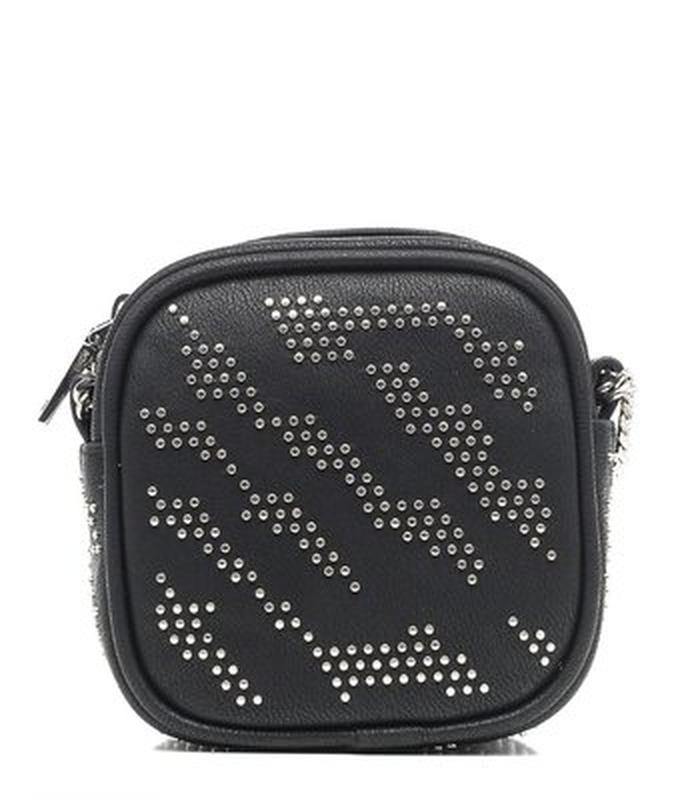Ручка з ланцюжка (ланцюжок подвійна, довжина від кріплення до кріплення однієї частини приблизно 110см), виріб прикрашений маленькими заклепками-точками, зверху застібка на блискавку,одне основне відділення,міцна тканинна підкладка. Ширина: 6,0 cm . Довжина: 15 cm . Висота: 15 cm. Матеріал кожзам.Декор із металу, надійно прикріплений.Оригінал. Стан нової. Вигулювалася 2 рази.