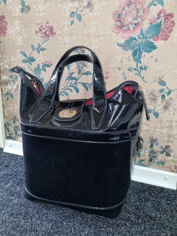 РОЗВАНТАЖУЮ ШАФУ. Гарна вмістка лакована сумка, тримає форму, чорна, без зовніх дефектів. На підкладці, з двома відділами та внутрішнім відділом на молнії. На підкладці є невеликий поріз, на фото видно, не завадить в носінні В користуванні була мало. Додаткові фото надішлю. Ширина 27 Висота 33 Ширина по низу (дно) 17