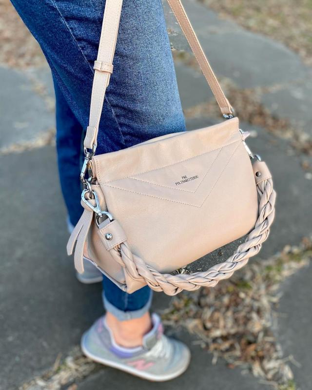 Матеріал: Натуральна шкіра Колір: бежево рожевий Розміри: 28×10×21,5 Комплект: 2 ремінці - шкіряний на плече (регулюється) та шкіряний плетений на руку