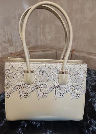 Шикарна стильна, брендова сумка фірми Solano, лакова, з дорогих та якісних матеріалів, замки, круживо, каміння. Якість чудова. Ширина 31см, висота 28 см, довжина ручок 55см, дно 11см.