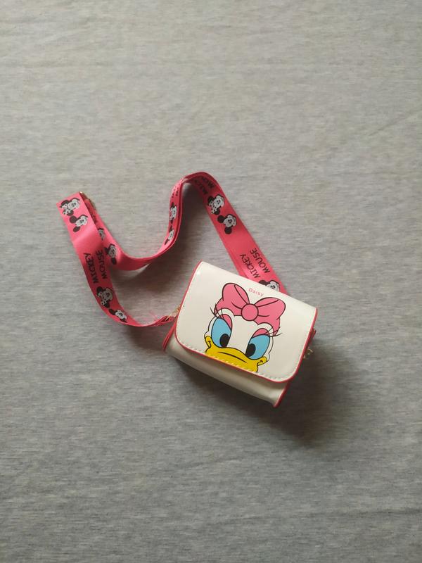 Маленька дитяча сумочка. Зроблено з м'якої екошкіри, ремінець з тканини регулюється, застібка кнопка. розміри: ширина – 11 см, висота – 8 см, ширина – 4 см Розрахована на дитину 2-4 років