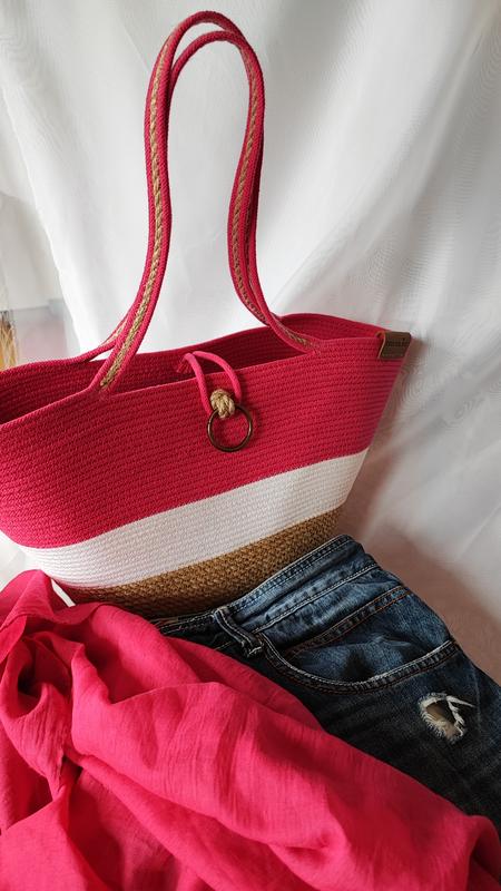 сумка трикольороа у техниці зігзаг сшита зі джуту та шнурів розмір низ 20см, верх 40 см висота 27 см ручки 50 см легка в догляданні