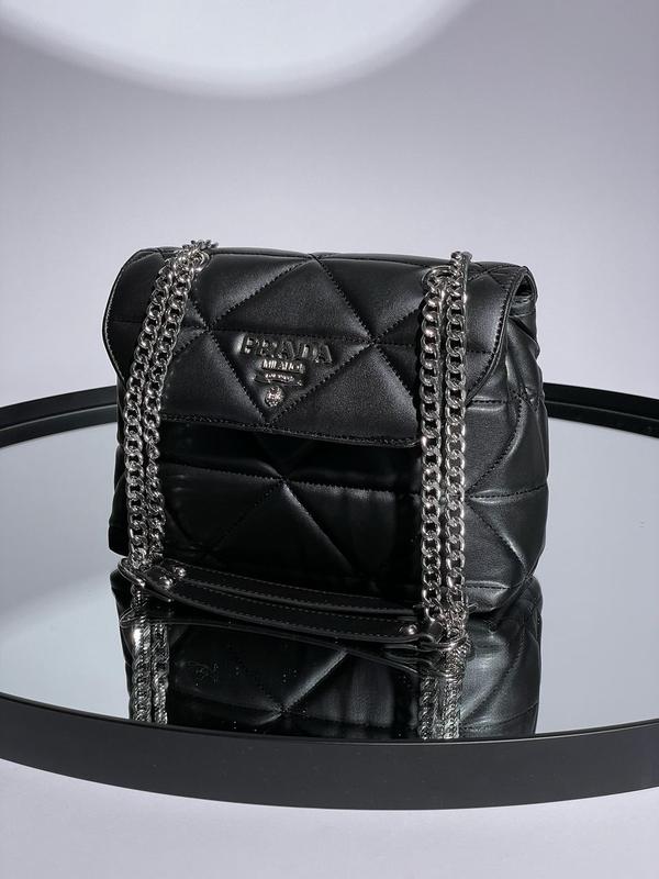 👜 Prada Nappa Spectrum Black/Silver 📐 Розмір: 25 х 18 х 9 см 🧵 Матеріал: Еко Шкіра Сумка виконана з гладкої екошкіри, з трикутним простроченням. Усередині два відділення, в одному з яких є невелика кишенька. Підкладка всередині сумки текстильна, з фірмовою нашивкою. Ремінець сумки на ланцюжках, з ручками із еко шкіри. Регулюється ремінець як під носіння в руці, так і через плече. Комплектується у брендованій коробці та папері (за додаткову плату можна придбати фірмовий пакет, пильовик та документи).
