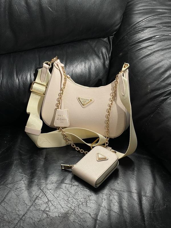 👜 Prada Re-Edition 2005 Cream Saffiano Leather Bag 📐 Розмір: 28 х 16 х 7 см 🧵 Матеріал: Еко Шкіра Сумка виготовлена з бежевої еко шкіри. Усередині одне суцільне відділення з брендовим металевим логотипом. Підкладка всередині сумки із чорного текстилю з фірмовими написами. Ремінець із якісного текстилю, з фірмовими написами, регульованої довжини. На ремінці є також невелика кишенька для дрібниці. Також є золотий ланцюжок на карабінах. Комплектується у брендованій коробці та брендованому папері (за додаткову плату можна придбати фірмовий пакет, пильовик та документи).