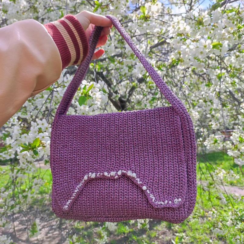 Сумка ручної роботи на плече з фігурним краєм з поліефірного шнура ° Гарного бузкового кольору ° Є магнітні кнопки-застібки ° Тримає форму, можна прати ° Має підклад всередині Заміри сумки: висота 20 см, ширина 25 см, товщина дна та стінок 4,5 см, довжина ручки 47 см