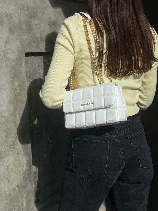 👜 Michael Kors SoHo Small Quilted Leather Shoulder Bag White 📐 Розмір: 22 х 13 х 9 см 🧵 Матеріал: Еко Шкіра Сумка виготовлена з еко шкіри, прострочена. Всередині одне велике відділення, є невеличка кишеня на застібці. Підкладка всередині з брендованого текстилю. Ручки з еко шкіри на ланцюжках, довжина регулюється як для носіння через плече так і у руці. Комплектується в брендовану коробку та брендований папір (за додаткову плату можна придбати фірмовий пакет та документи).