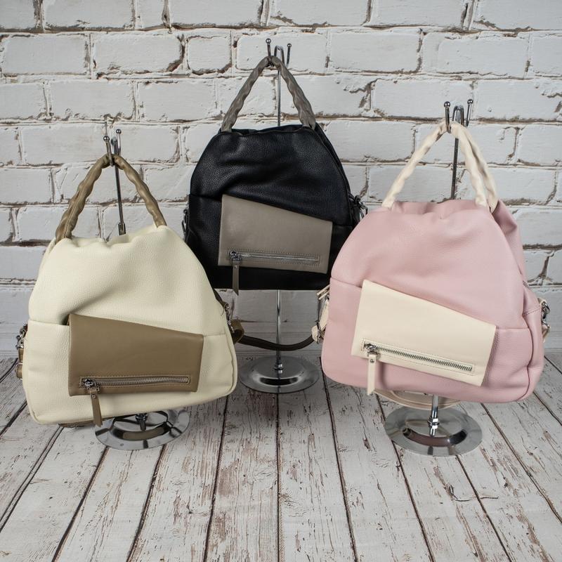 Мягкая вместительная сумка. Материал - эко кожа. Аксессуары - никелированные. Сумка закрывается на металлическую молнию. Две короткие нерегулируемые ручки - цепочки с оплёткой из эко кожи, поэтому очень удобна в руках. Высота ручек - 12 см. Дополнительно имеется длинная регулируемая ручка. Максимальная длина ручки - 125 см. На лицевой стороне сумки расположен карман с клапаном на магнитной застёжке. На задней стороне расположен горизонтальный прорезной карман на молнии. Внутри - тканевая подкладка, одно большое отделение.