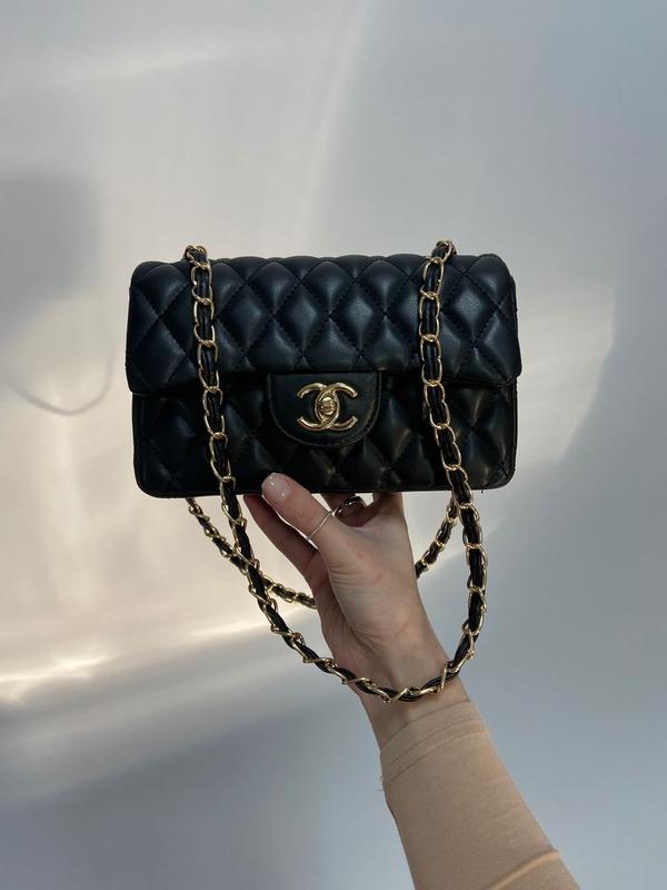 👜 Chanel 1.55 Black/Gold 📐 Розмір: 21 х 14 х 7 см 🧵 Матеріал: Еко Шкіра Сумочка виконана з м'якої, приємної на дотик еко-шкіри, з ромбовидним рядком. Ручка фіксованої довжини, у ланцюг вплетена шкіра. У сумці одне відділення, є кишенька на блискавці. Внутрішня підкладка з екошкіри вишневого кольору з вишивкою шанель. Комплектується у брендованій коробці та брендованому папері (за додаткову плату можна придбати фірмовий пакет, пильовик та документи).