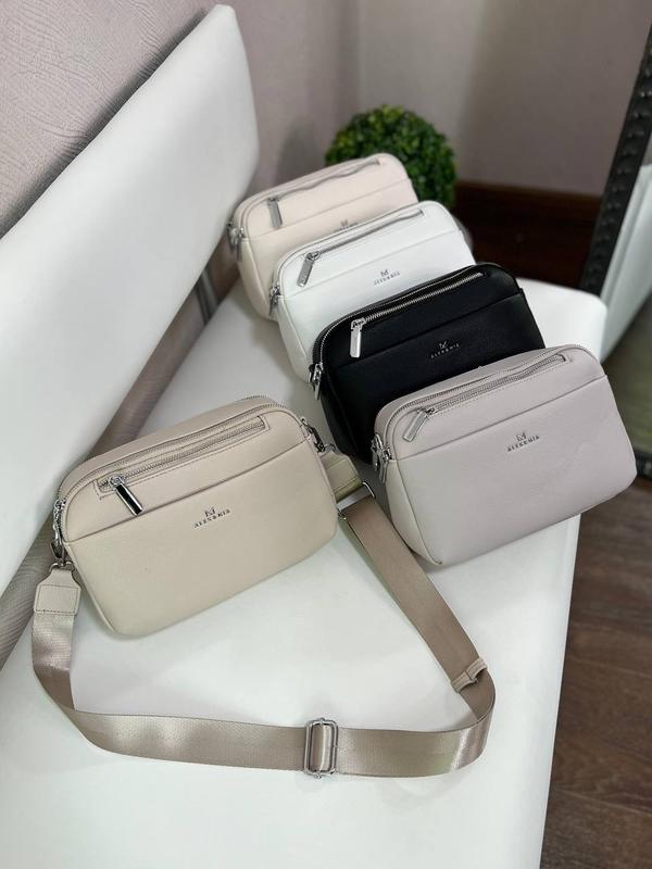 •шкір-зам. •два відділа. •кишеня попереду, всередині і позаду. •довгий ремінець регулюється. •колір: чорний, білий, сірий, молочний, беж. •розмір: 16*25*8.