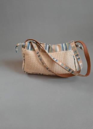 Модель виконана з соломки та текстилю, ручки шкіра Застібка магнитна кнопка Одне відділення, всередені кишеня на блискавці Висота 14 см Ширина 23 см Донишко 5,5 см Дві ручки довжиною 54 см